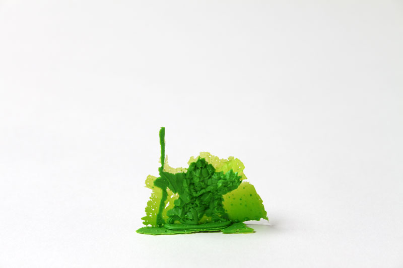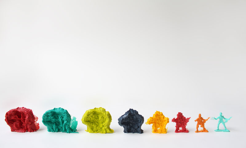 For the exhibition, the soldiers were displayed reading from left to right, suggesting that the amorphous blobs are mutating into the humanoid forms, as though they are the embryonic ‘roughed out’ forms that lead to the final and complete more familiar soldiers, however this is actually the opposite. In relation to the exhibition theme, the more humanoid soldiers are actually the blank material from which the final evolved blobs emerge. |